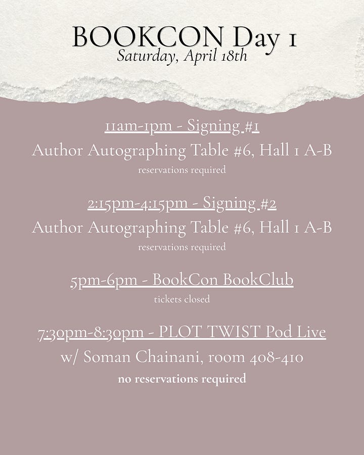 I’m flying to Boston on Tuesday for a bookseller event (closed to the public) before heading to New York for: BOOKCON! By now you’re probably sick of hearing about it but I’m posting my schedule here just in case. All my signing reservations are sold out but there will be standby lines I will do my best to accommodate! My Romantasy Panel is also sold-out but the LIVE PODCAST WITH SOMAN CHAINANI is not ticketed! Feel free to join us Saturday night. And if you see me on the floor, don’t be afraid to say hello!!
